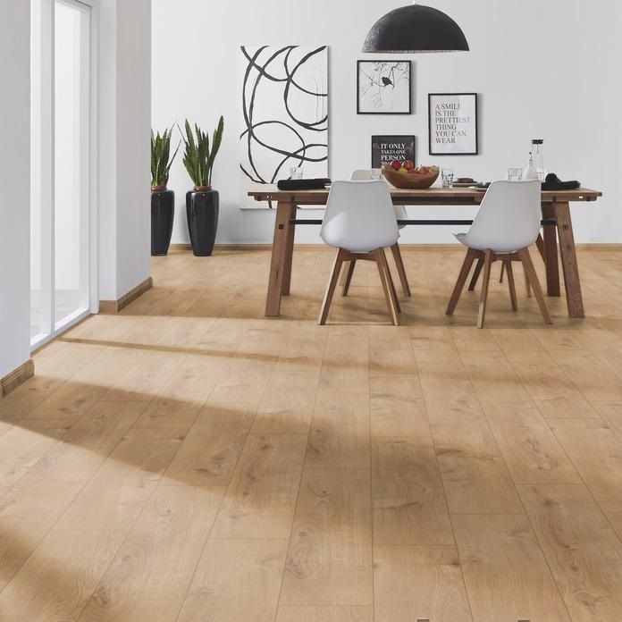 Kronospan - ламинат который возможно эксплуатировать как в домашних условиях, так и в коммерческих целях. Прочность (класс) напольного покрытия - 32, толщина 8 мм. Декоры с разнообразной цветовой гаммой "натуральной древесины". Ламинат устойчив к различным повреждениям и воздействию влаги - защитное покрытие Aquastop. Он неприхотлив в уходе и антиаллергенен, что особо важно для помещений в которых проживают маленькие детки. Монтируется без использования каких-либо инструментов и клея, лишь при помощи простой замковой системы (замок-защелка).